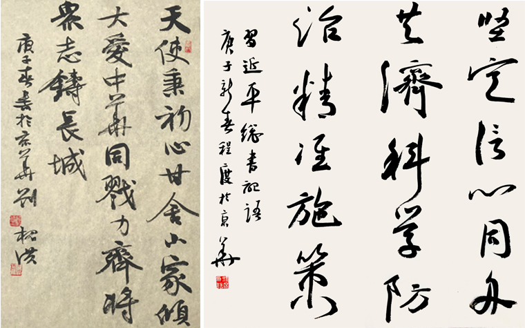 展览现场,油画作品《众志成城》格外引人注目,油画家协会主席田凤银在与大家分享交流自己创作心得时激动的说:“自新冠肺炎疫情发生以来,全国上下万众一心,为抗击疫情付出了很大努力,作为一名文艺工作者,虽然上不了前线,但我们要发挥出艺术家在抗击疫情中的职责和使命”,于是她拿起画笔,连续创作《众志成城》、《傲骨花开别样红》等油画作品,让实际行动表达朝阳群众抗击疫情的必胜信心。“疫情无情人有情,作为首都艺术家我们必须要站起来”书法家协会主席沈莉表示,“希望能够用自己的书法作品,为中国祈福,用中国的传统文化为抗击疫情助力加油。”