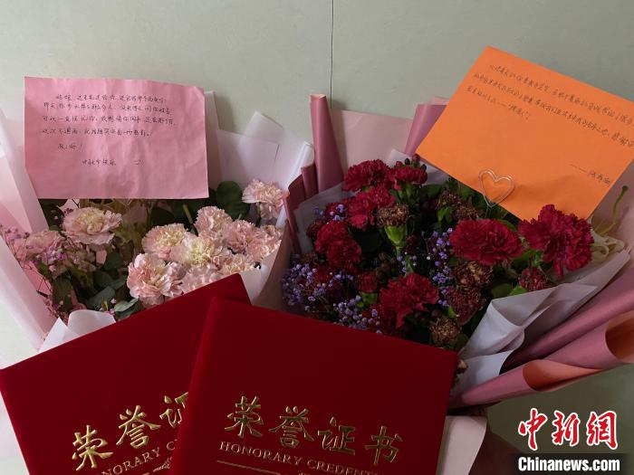 图为“摆渡女孩”们收到的鲜花感、感谢信以及荣誉证书。 刘梦珂 摄