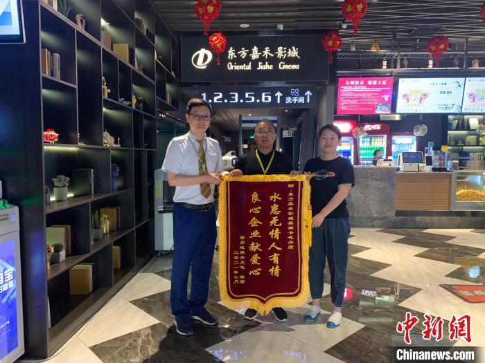 图为受助单位为杨震(中)所在影院送来锦旗以示感谢。 杨震供图