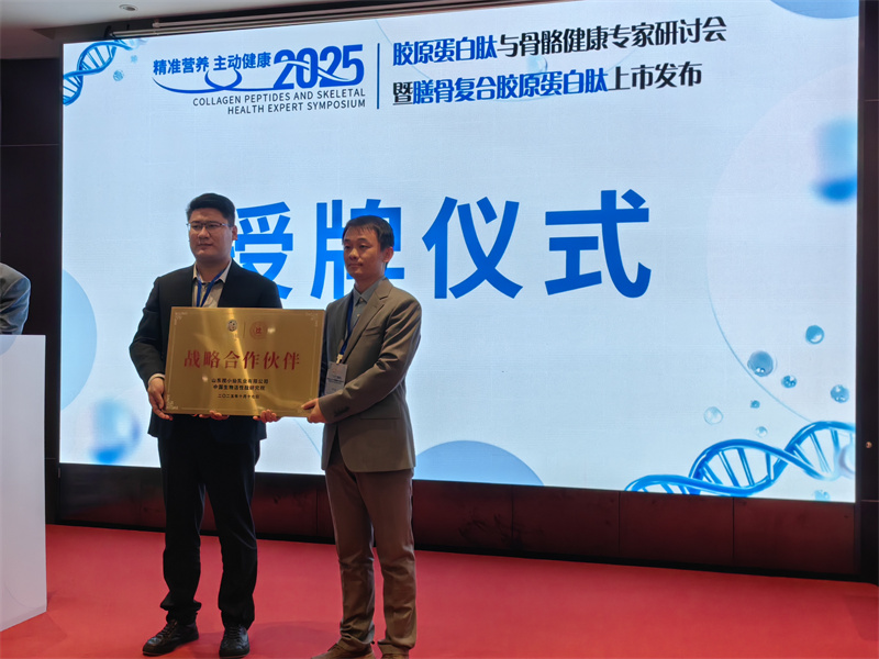 北京大学医学部李勇课题组鲍雷博士(右)代表中国生活活性肽研究院向山东视小仙乳业有限公司总经理杨金中(左)授予战略合作伙伴。