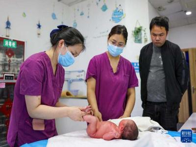 4月7日,在贵州省铜仁市玉屏侗族自治县人民医院产科,医护人员为新生儿家属传授按摩技术。