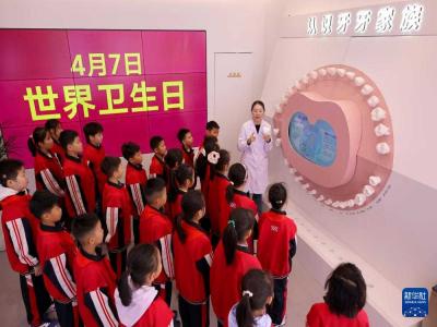 4月7日,在山东省枣庄市口腔科普馆,医务人员为前来参观学习的小学生们普及牙齿健康知识。