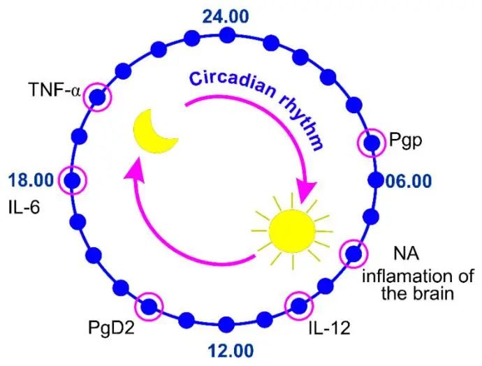 △血脑屏障对细胞因子、激素渗透性的生物钟(图片来自文章Brain Mechanisms of COVID-19-Sleep Disorders)