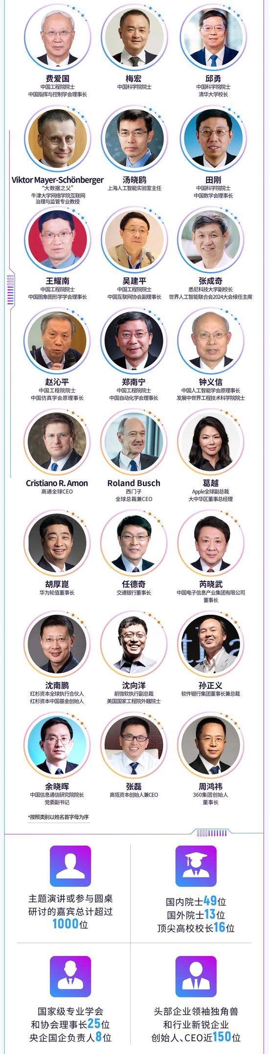 一是重磅嘉宾数量更多。目前,约瑟夫•斯发基斯(Joseph Sifakis)、惠特菲尔德·迪菲(Whitfield Diffie)、约翰•霍普克罗夫特(John Hopcroft)、曼纽尔·布鲁姆(Manuel Blum)、姚期智等图灵奖得主,迈克尔•莱维特(Michael Levitt)等诺奖得主,Linux之父林纳斯•托瓦兹(Linus Torvalds)、大数据之父维克托•舍恩伯格(Viktor Schönberger),西门子CEO博乐仁(Roland Busch)、高通全球CEO安蒙(Cristiano R. Amon)、华为轮值董事长胡厚崑、360董事长周鸿祎已确认出席,腾讯、阿里、百度、京东等企业创始人、CEO或CTO也将参会。据初步统计,大会演讲及参与圆桌嘉宾超过千位,较去年将近翻番。其中国内院士49位,国外院士13位,顶尖高校校长16位,国家级专业学会和协会理事长25位,科技龙头企业、央企国企负责人、独角兽和行业新锐企业创始人、CEO近150位。