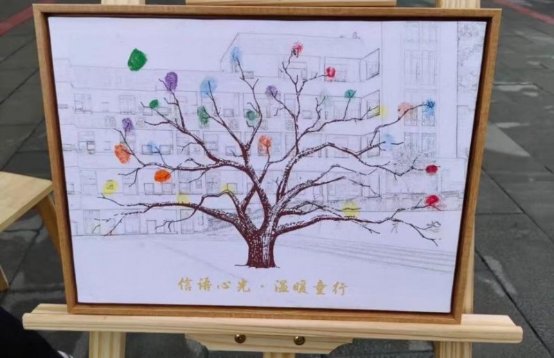 摊位前,同学们拿取一张张明信片,写下想对孩子们说的话:是校园里的趣事,是一句加油,是一幅Q版漫画……现场的指印画布更是快乐聚集地,空白画布会被无数个色彩斑斓的手指印填满,凝聚了同学们的热忱与真心。