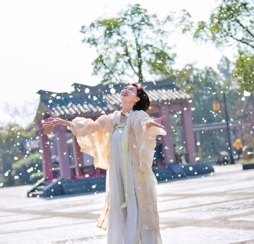 15日,在天柱山风景名胜区《孔雀东南飞》文化园里,一位战疫女英雄换上汉服,一秒“穿越”。应文 摄