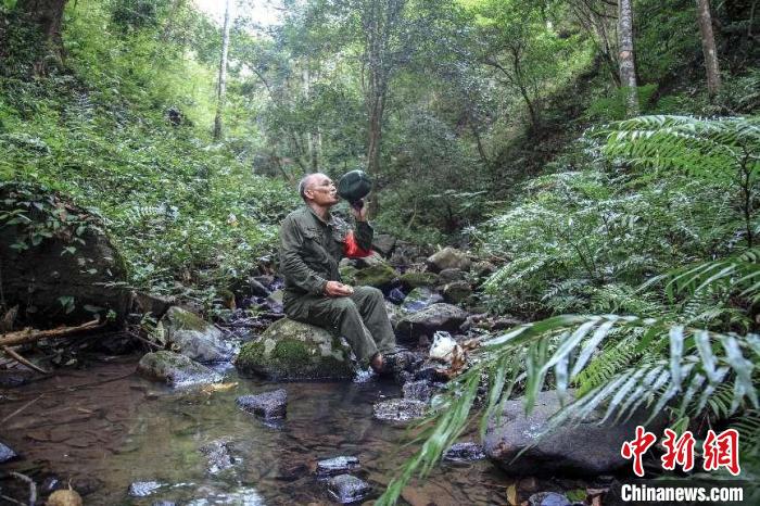 古德财一天巡护面积不少于10平方公里,累了就在林间歇息一会,渴了捧溪水解渴。 安远县委宣传部供图