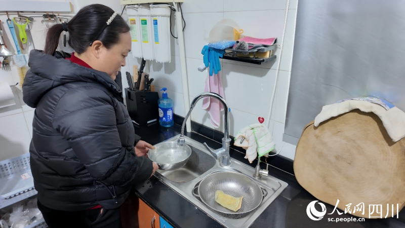 飞龙村村民梁金会使用自来水。人民网 袁曼倪摄