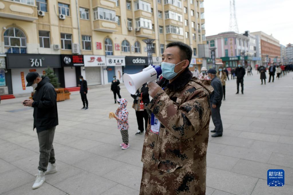 9月25日,在哈尔滨市巴彦县一核酸检测点,工作人员在现场维持秩序。