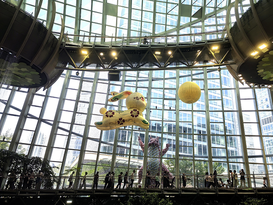 走进光环购物公园,一只放大了100倍的“非遗玉兔灯”,上演着“玉兔逐月”的中式浪漫。在金黄森林布景区域,阶梯两侧满是金黄色的行道树,前来“打卡”的市民络绎不绝。