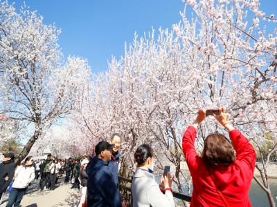 3月20日,天津市红桥区北运河畔,市民游客漫步“桃花堤”,一览春色。新华社发