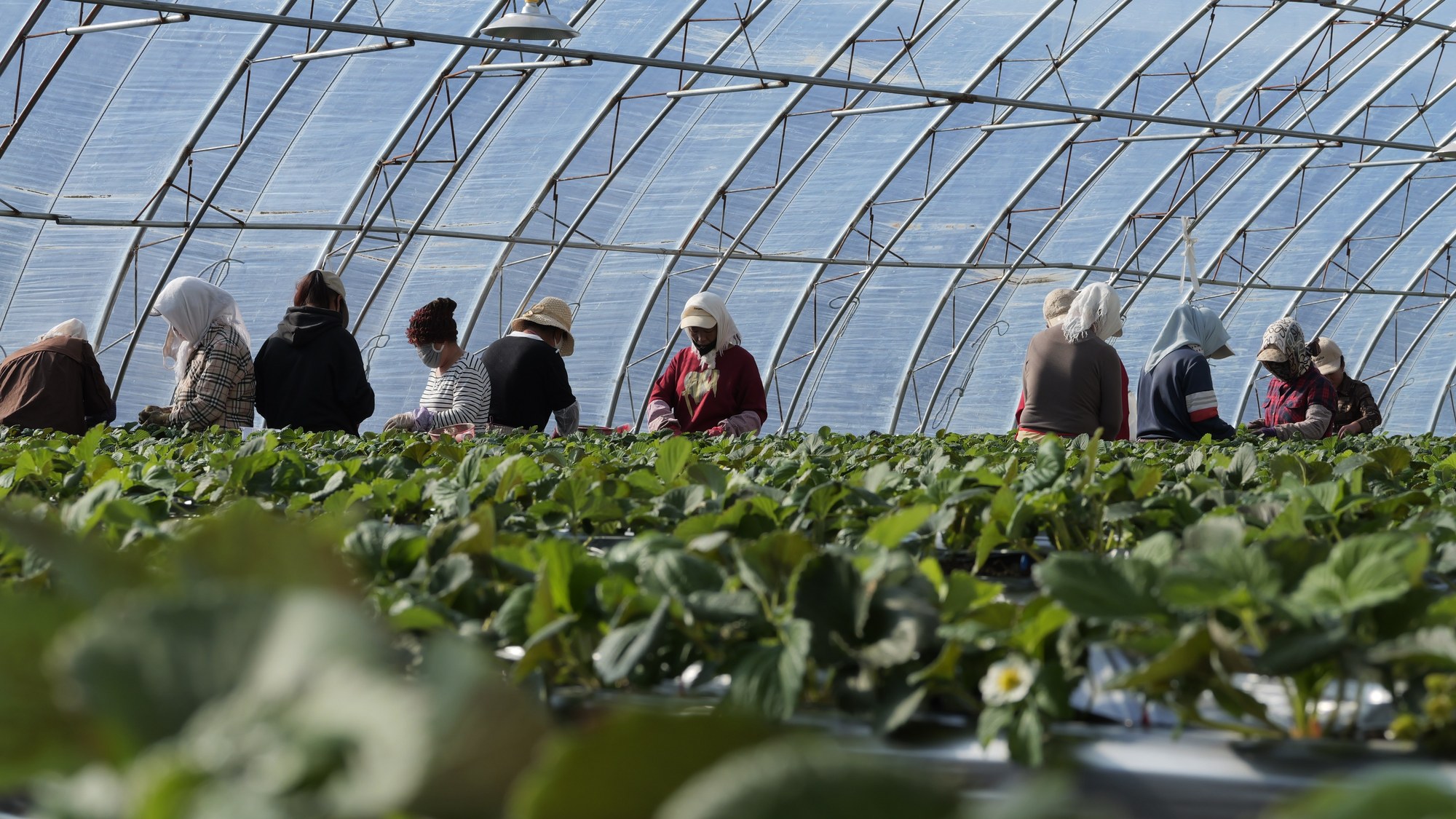 工人正在草莓棚内进行保温膜铺设(李丽娟 摄)