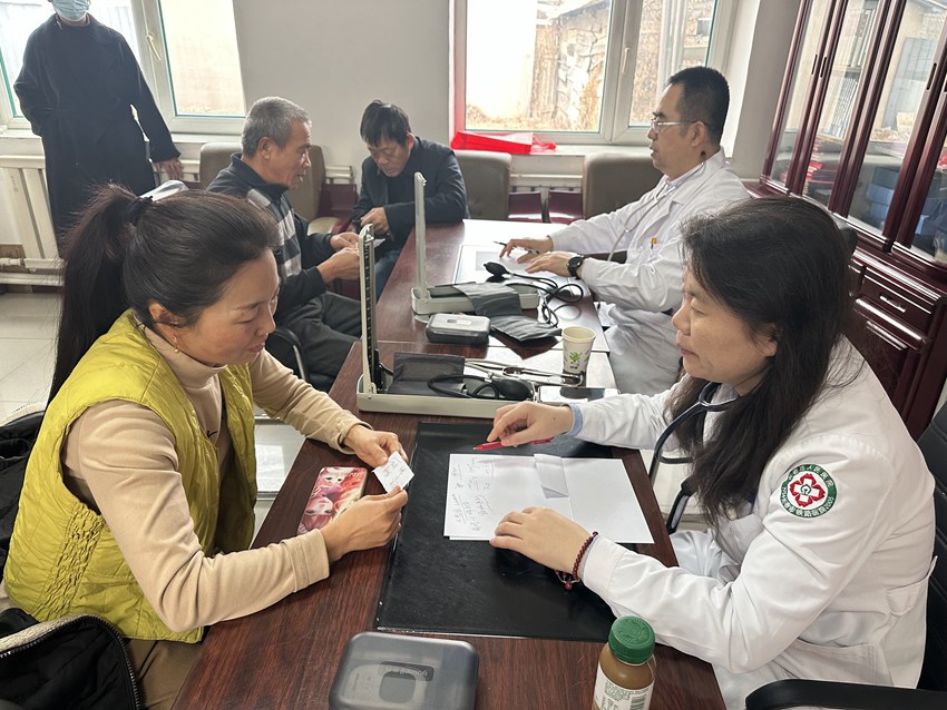 在辉南镇东关村村部,医疗专家团队针对东北地区高发的心脑血管疾病、高血压、糖尿病等病症开展免费义诊,细致问诊、量血压、开药方,为百余位村民提供个性化健康指导。