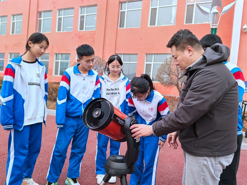 同样沉浸在科普浓厚氛围里的,还有辉南二中的同学们,大家争先恐后通过天文望远镜探索太阳的奥秘。天文科普专家杨治国、邹洪瑶带领50余名青少年学生走进星空世界,教室内天文知识讲座与户外观测实操相结合,点燃了乡村孩子探索宇宙的科学梦想。
