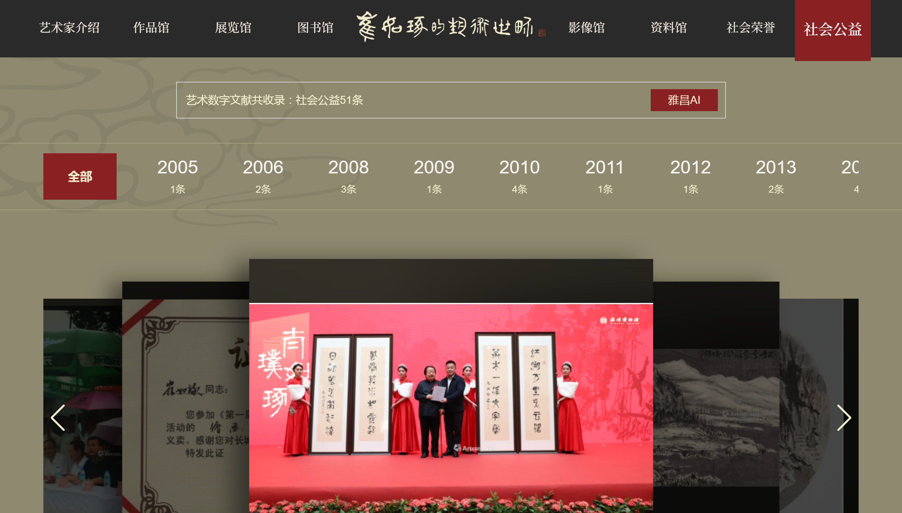 崔如琢先生长期投身社会公益,积极进行艺术捐赠。系统特别设置“社会公益”模块,全面记录艺术家的捐赠作品信息及公益活动,包括作品捐赠、公益展览、慈善拍卖等。