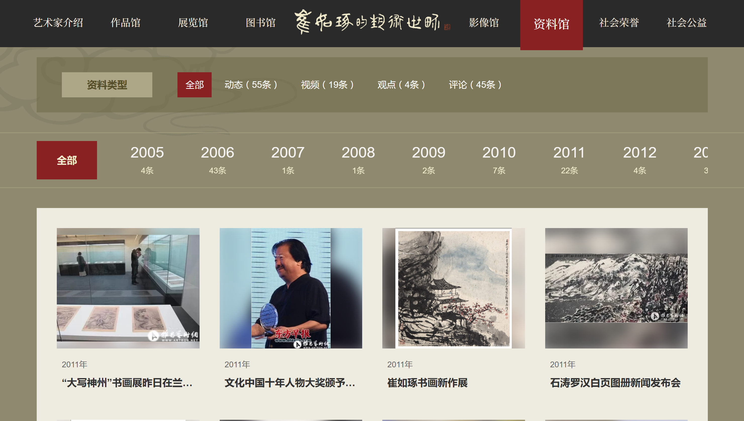 崔如琢艺术数字文献系统采用IT科技手段,整理、保存和管理艺术家的作品、出版著录、展览活动、创作经历、艺术评论、市场情况等相关文献资料,超越空间和时间,让艺术家的艺术生命、艺术精神作为人类的永恒财富,得以保护、传承、利用和创新。该系统包含八大模块:艺术家介绍、作品馆、展览馆、图书馆、影像馆、资料馆、社会荣誉、社会公益,构建艺术家的线上数字艺术馆。各模块根据不同应用场景,以多元形式展示,并拓展出丰富的数字化功能,提升艺术文献的管理与展示体验。