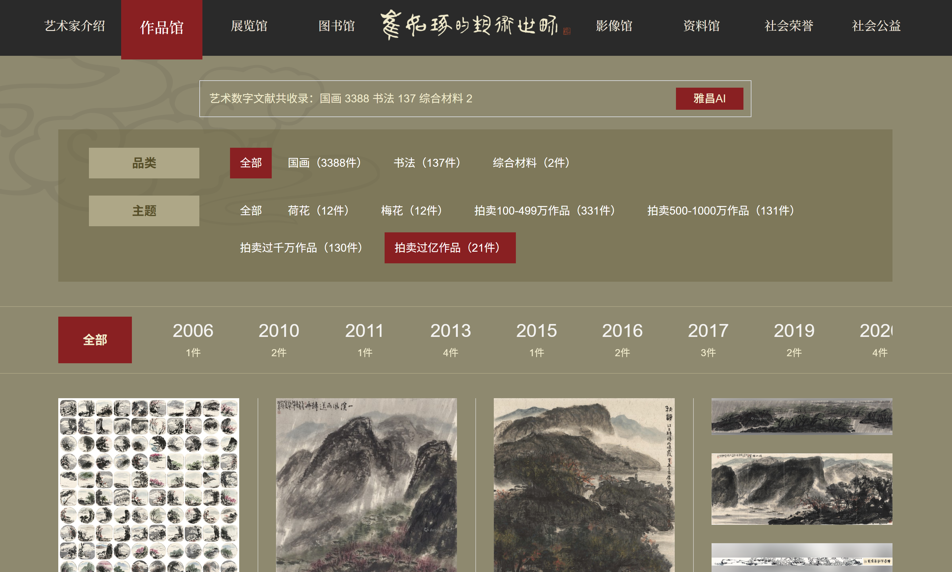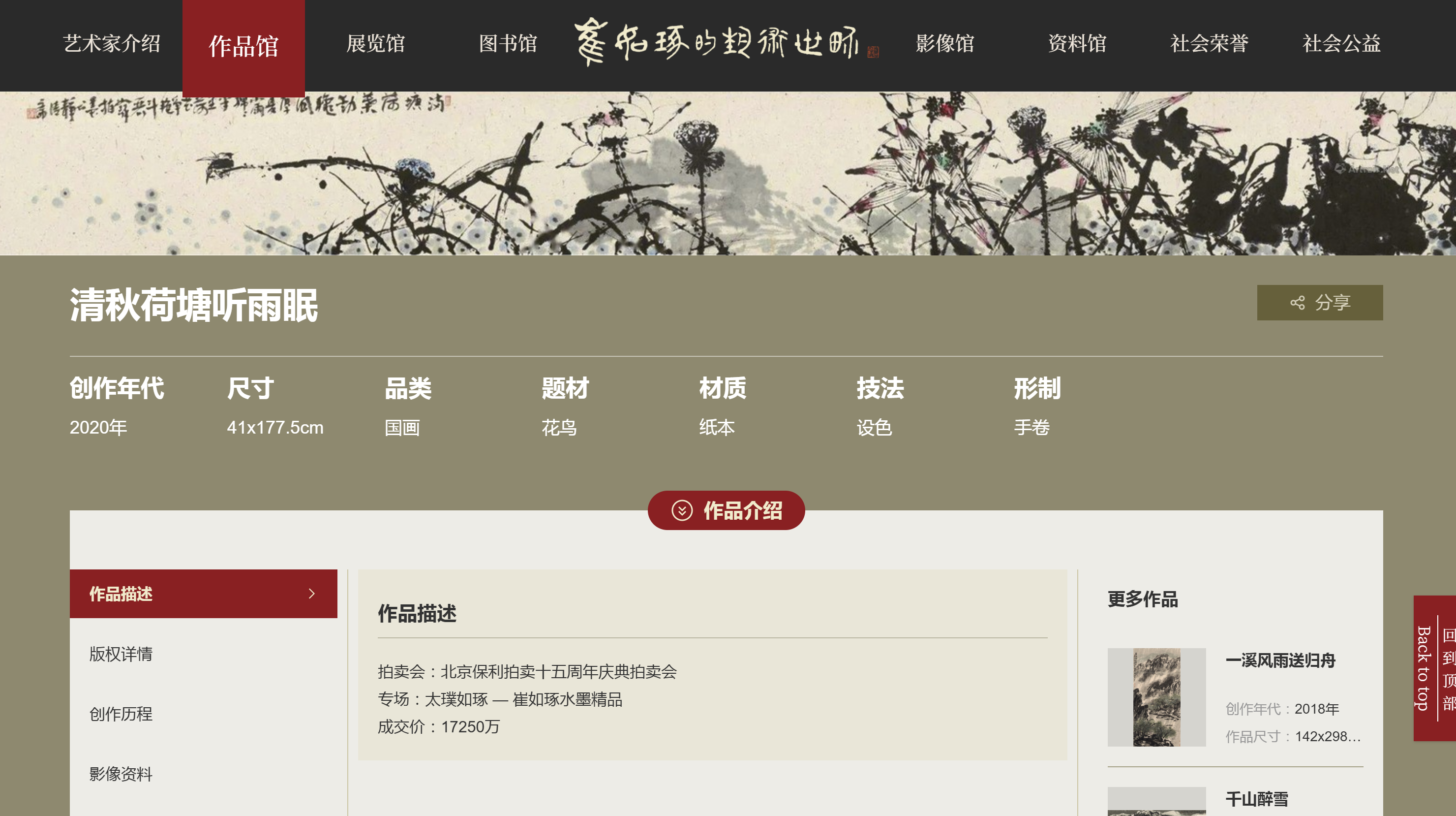 系统覆盖崔如琢先生上亿元级别的重要作品。每件作品均附带详细的创作背景、展览记录、拍卖数据及收藏信息,形成完整的数据链条。